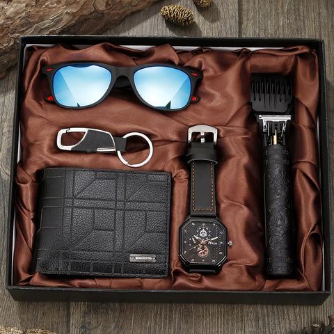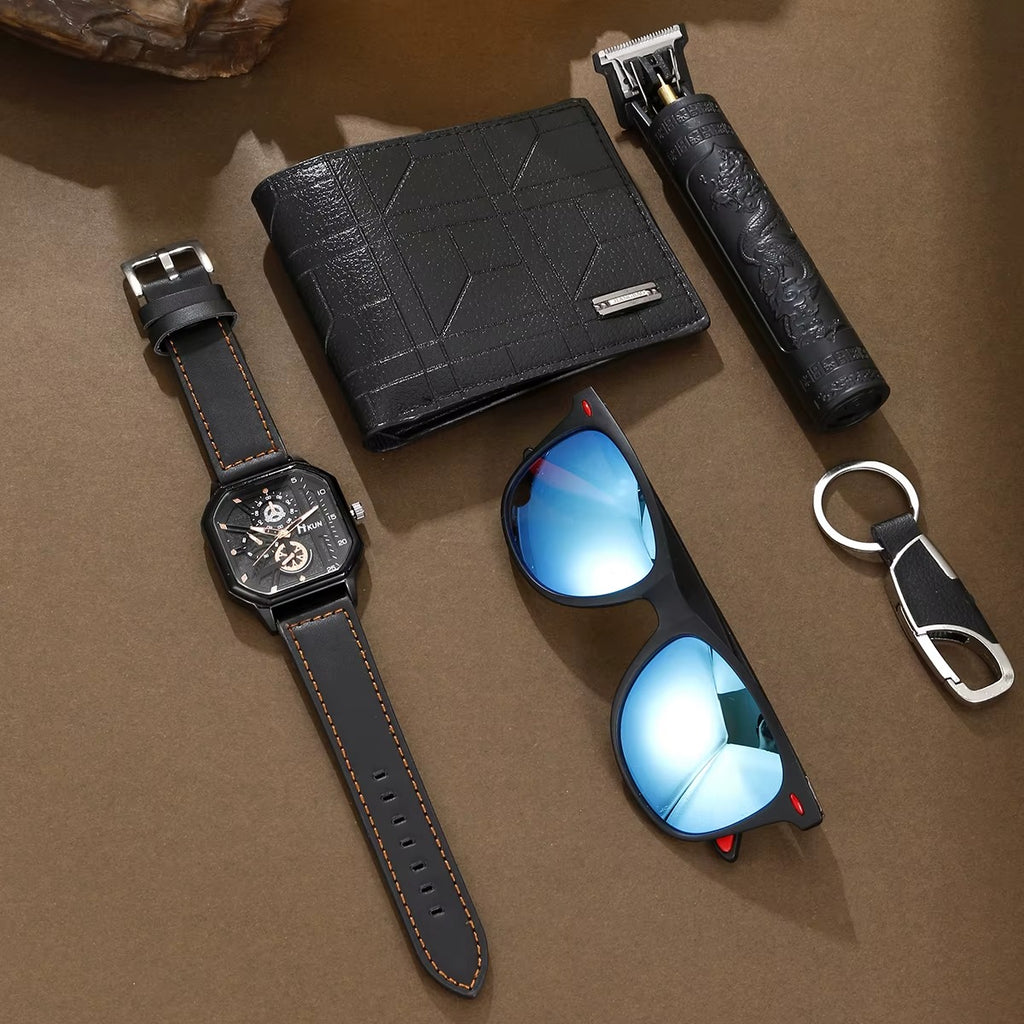 Um kit totalmente moderno e perfeito para aquele presente marcante. Surpreenda com moda e estilo com nosso kit exclusivo. Inclui relógio, óculos de sol, carteira em couro, chaveiro em aço e uma maquina de barbear. Perfeito para apresentar homens exigentes com qualidade e sofisticação.