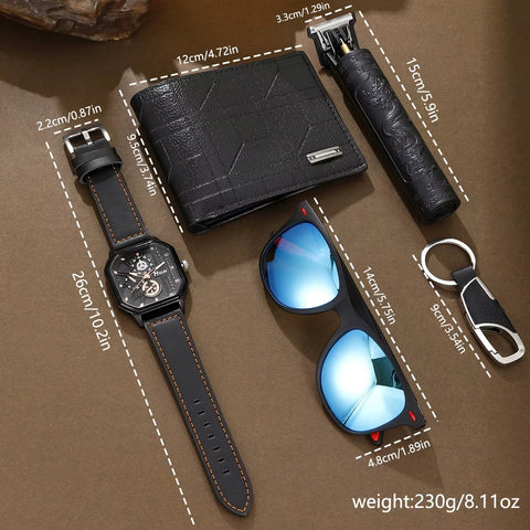 - Material: Relógio em aço + couro não é a prova d'água, óculos de sol em aço, carteira em couro, chaveiro em aço e maquina de barbear em aço;